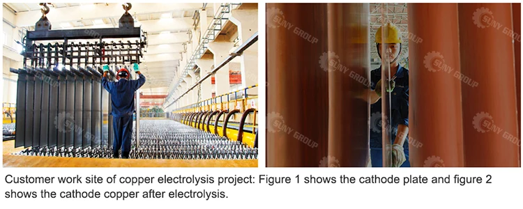 Anode plates are hung by their "handles" in electrolytic copper refining tank. Pure copper cathode sheets suspended on solid