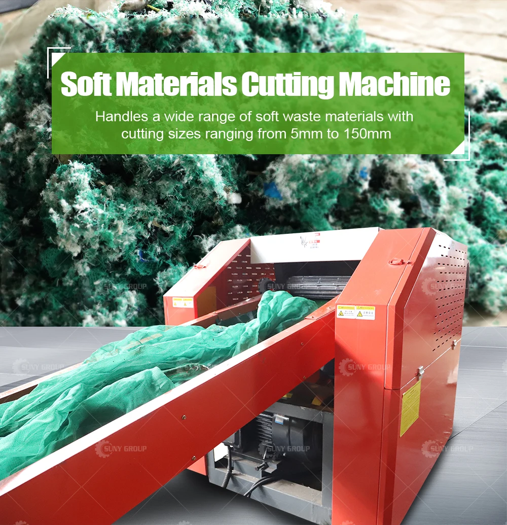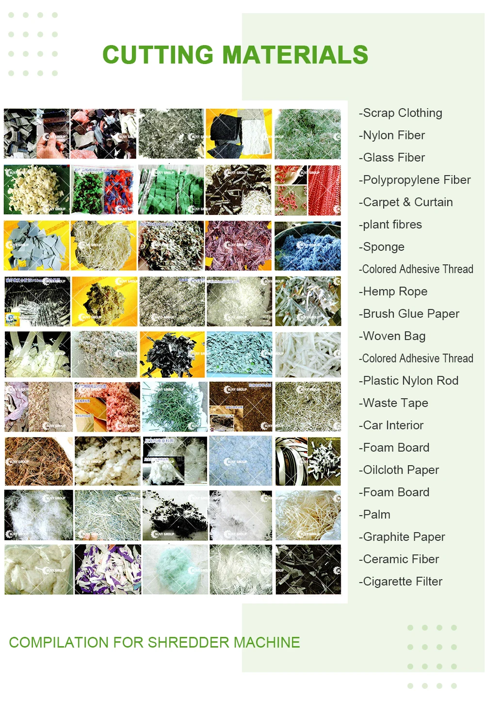 Fiber cutting machines are designed specifically for various soft waste materials,including scrap fabric, cotton yarn waste, old clothes, cotton wadding, synthetic fibers,linen, leather, plastic film, paper, labels, non-woven fabrics, and more.Below are samples of shredded materials.Handles a wide range of soft waste materials with cutting sizes ranging from 5mm to 150mm. lf you have specific materials you need to shred or want more details about our equipment, please contact our professional sales team.